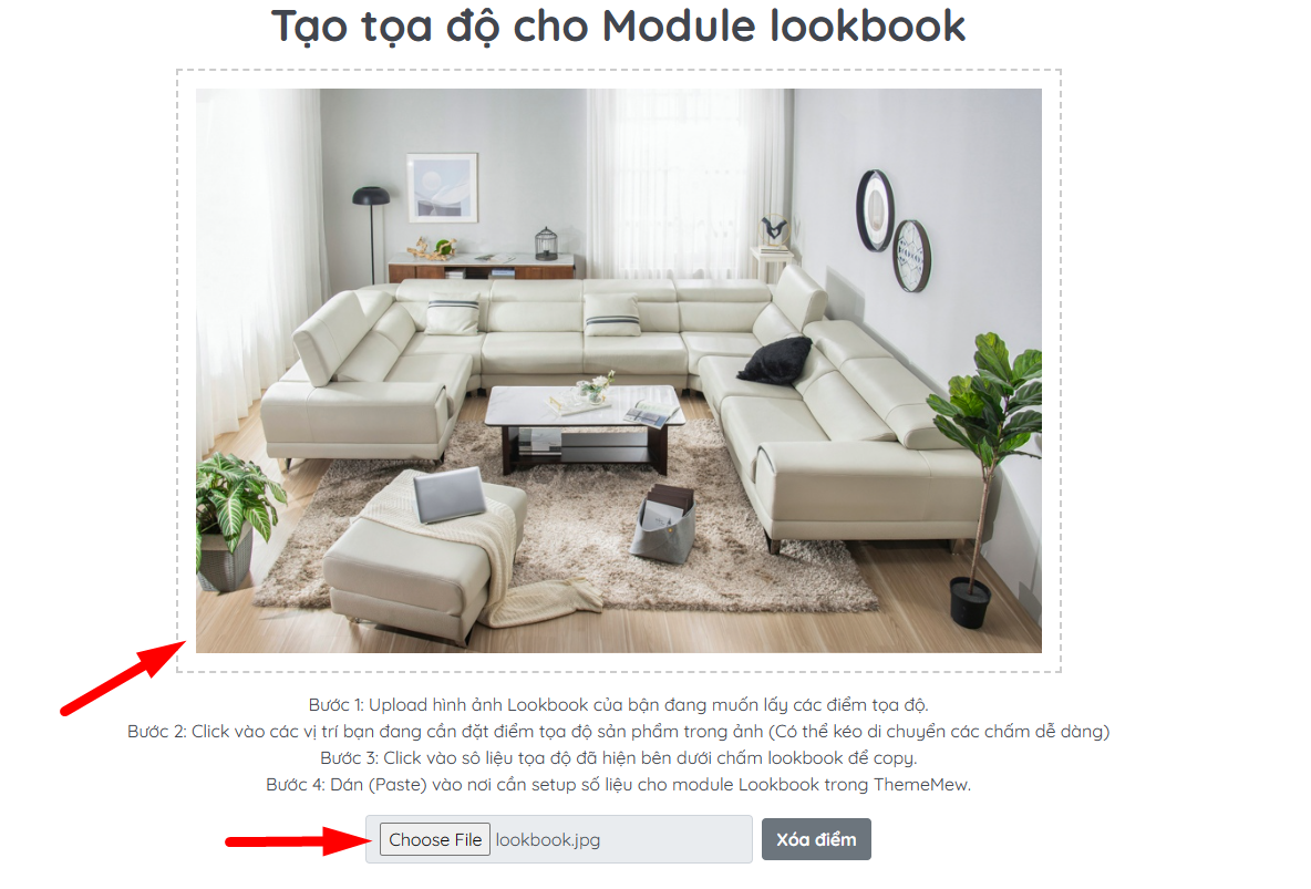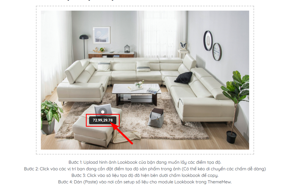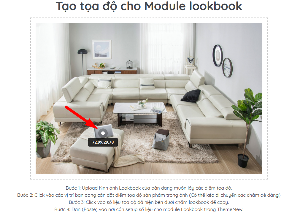 - (1) Tọa độ chấm sản phẩm trên ảnh. Để lấy tọa độ chuẩn bạn truy cập toolLookbook của Mew: Tạo tọa độ cho Module lookbook (mewtheme.com)