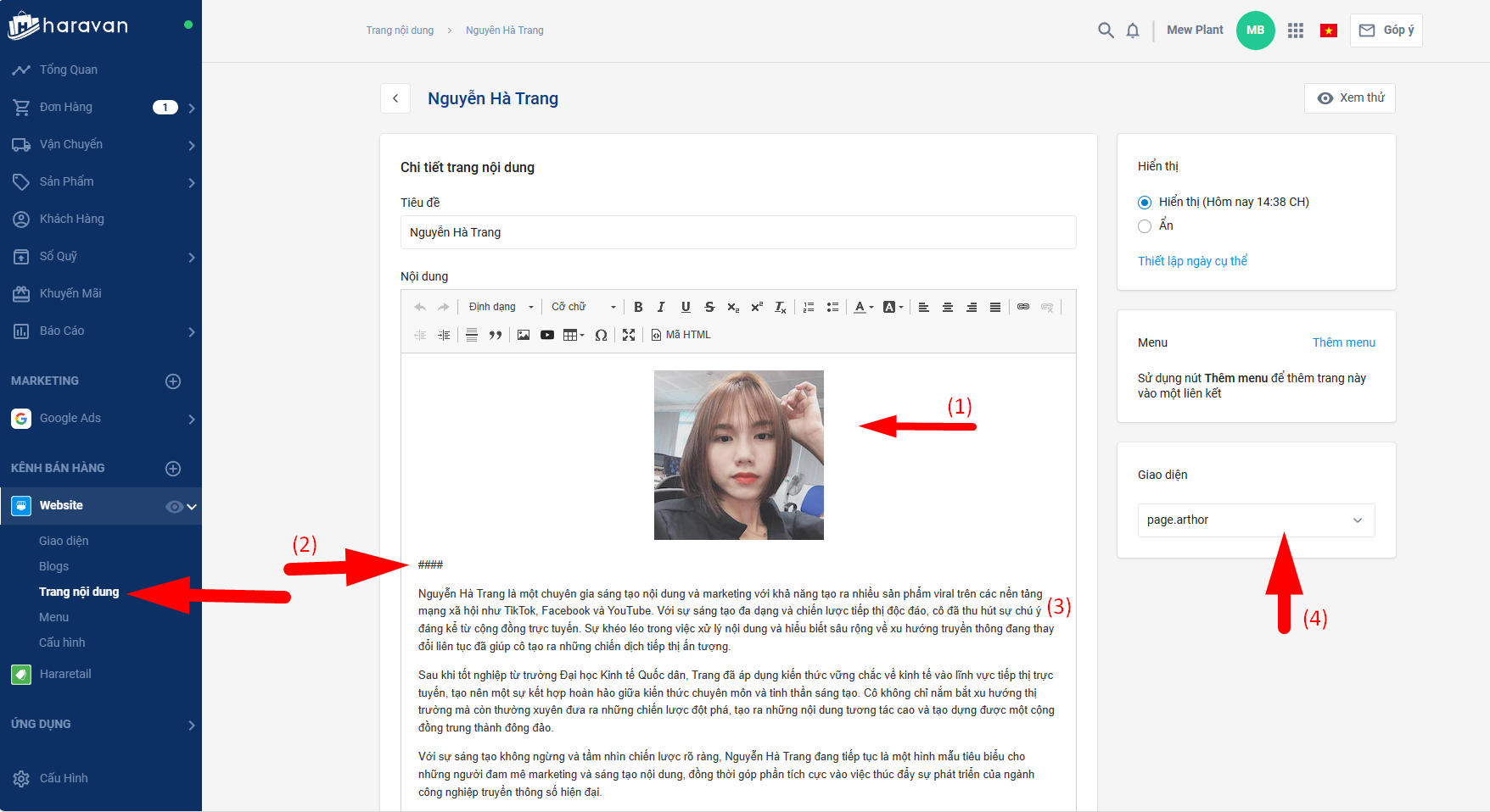 - Xuống dòng tiếp để nhập nội dung về tác giả như vị trí (3) trong ảnh - Chọn khung giao diện page.author như vị trí (4) trong ảnh