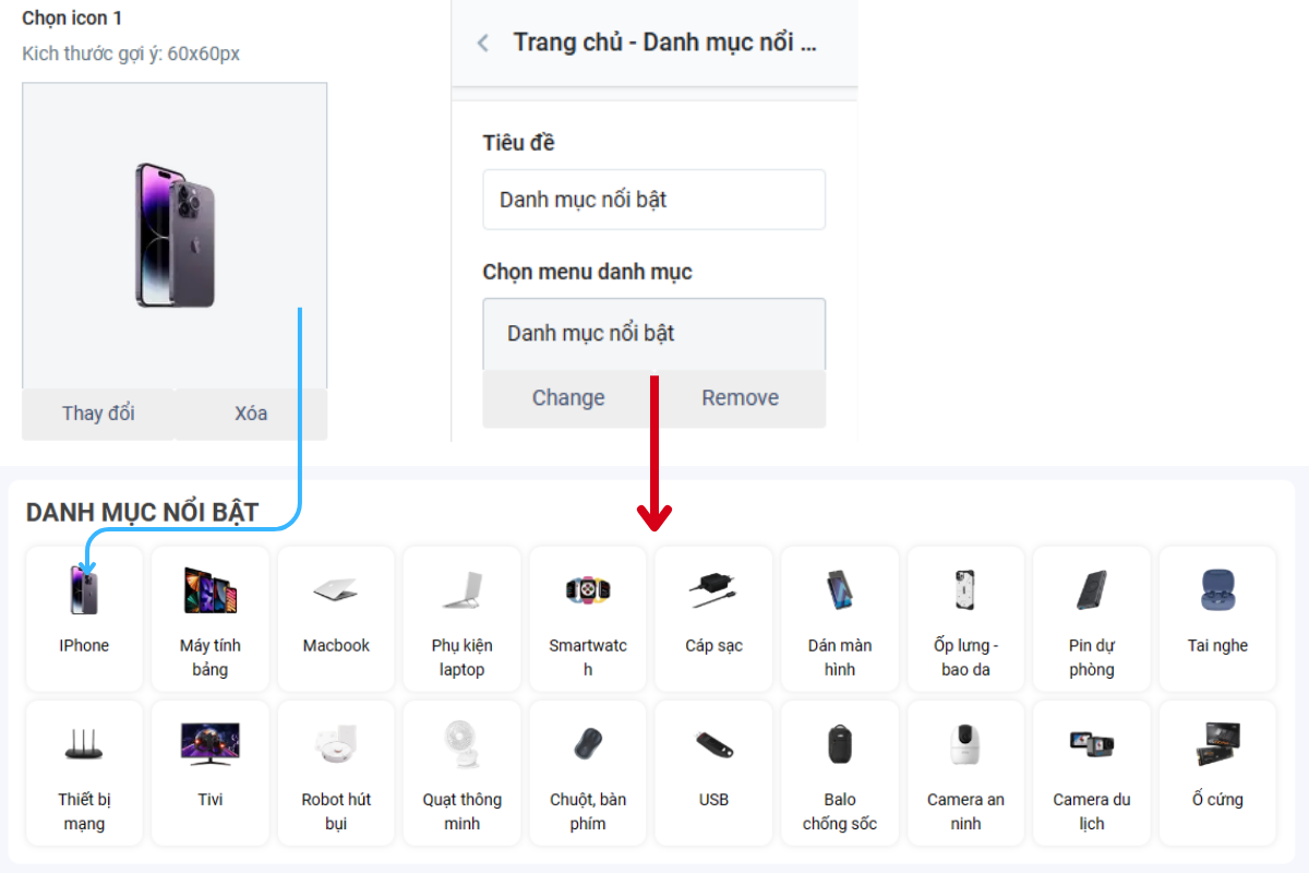 - Các danh mục này có thể điều chỉnh thông qua menu danh mục tương ứung, quý khách có thể tự tạo và thêm danh mục sản phẩm mong muốn và chọn tại thiết lập giao diện để hiển thị