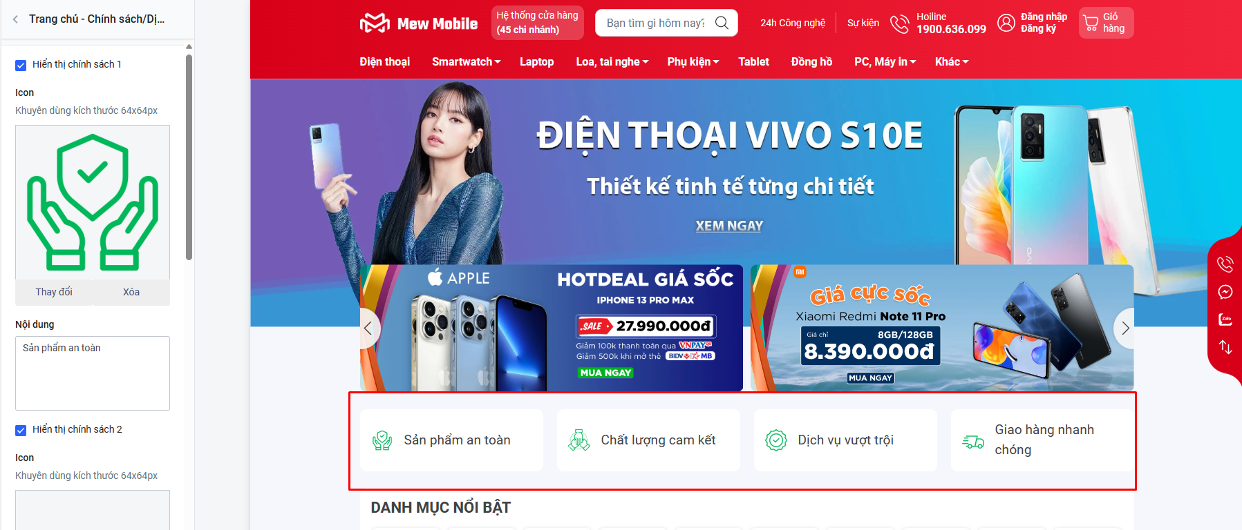 - Bật/tắt hiển thị các chính sách/ dịch vụ của cửa hàng, chô phép thay đổi icon và nội dung ngắn gọn của từng chính sách, hiển thị tối đa 04 chính sách