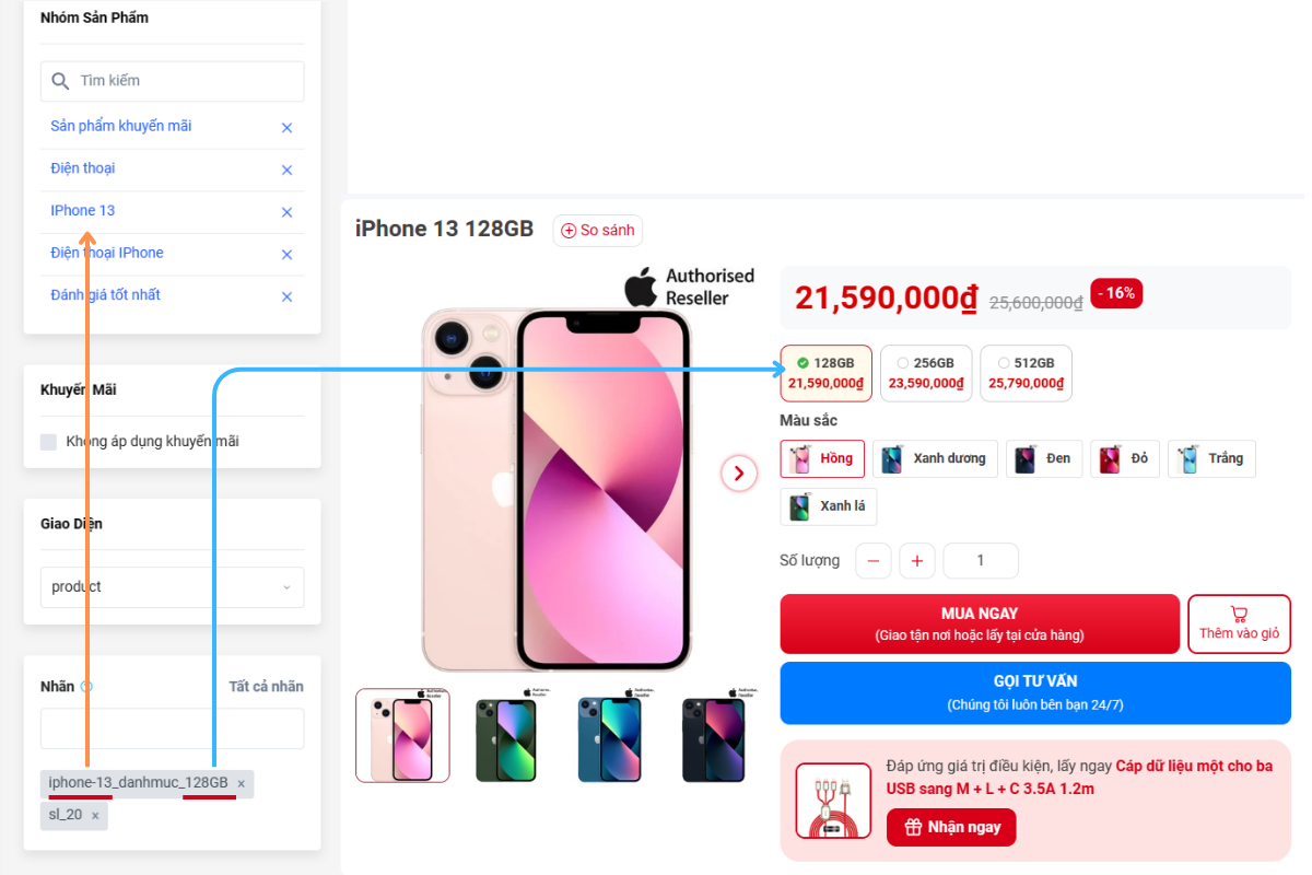 Mỗi sản phẩm đều thuộc 1 danh mục theo ví dụ ở đây là danh mục "iPhone 13" và mỗi sản phẩm đều chứa tag theo cú pháp như sau: