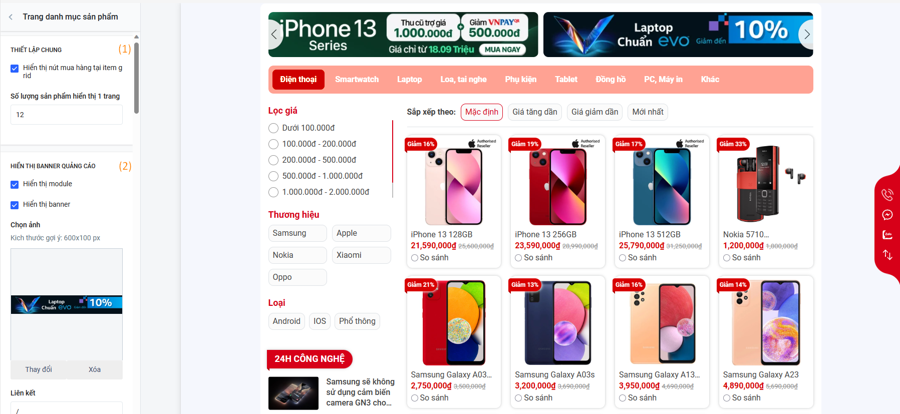 - (1) thiết lập bật tắt nút mua hàng tại item sản phẩm, số lượng sản phẩm hiển thị trên 1 trang
