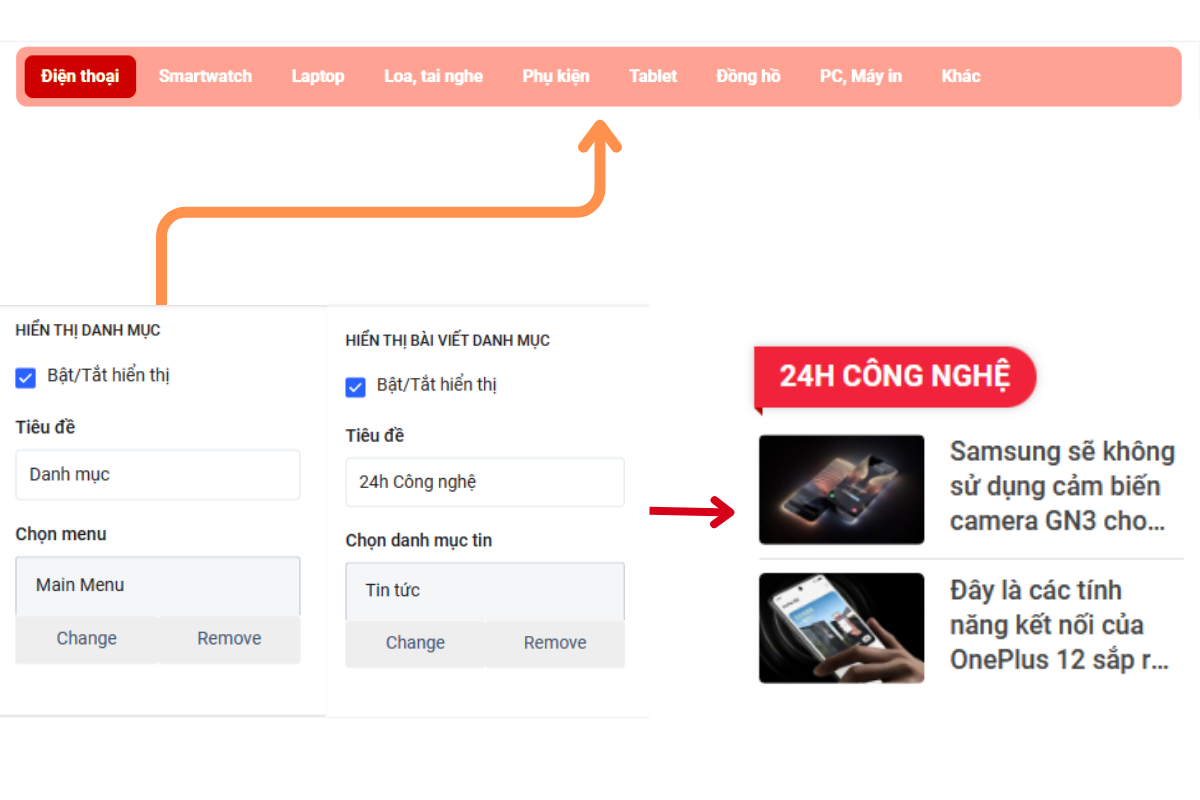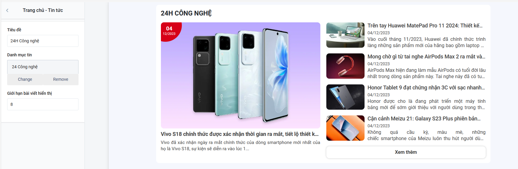 - Thiết lập hiển thị và chọn danh mục tin tức bên phải