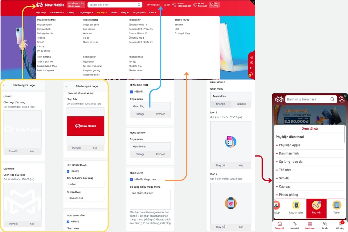 - Quản lý và thiết lập các mục liên quan đến phần đầu trang/ logo cũng như quản lý tuỳ chọn menu của bản PC và Mobile