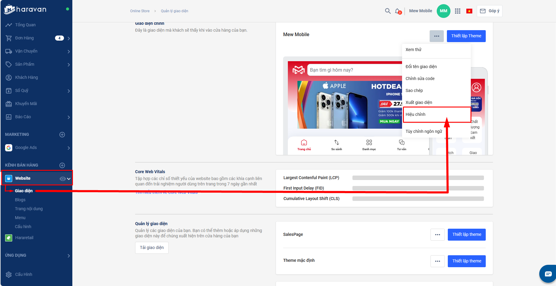Sau khi cài đặt theme mới lên cửa hàng, bạn bấm vào THIẾT LẬP GIAO DIỆN để tùy chỉnh theme.