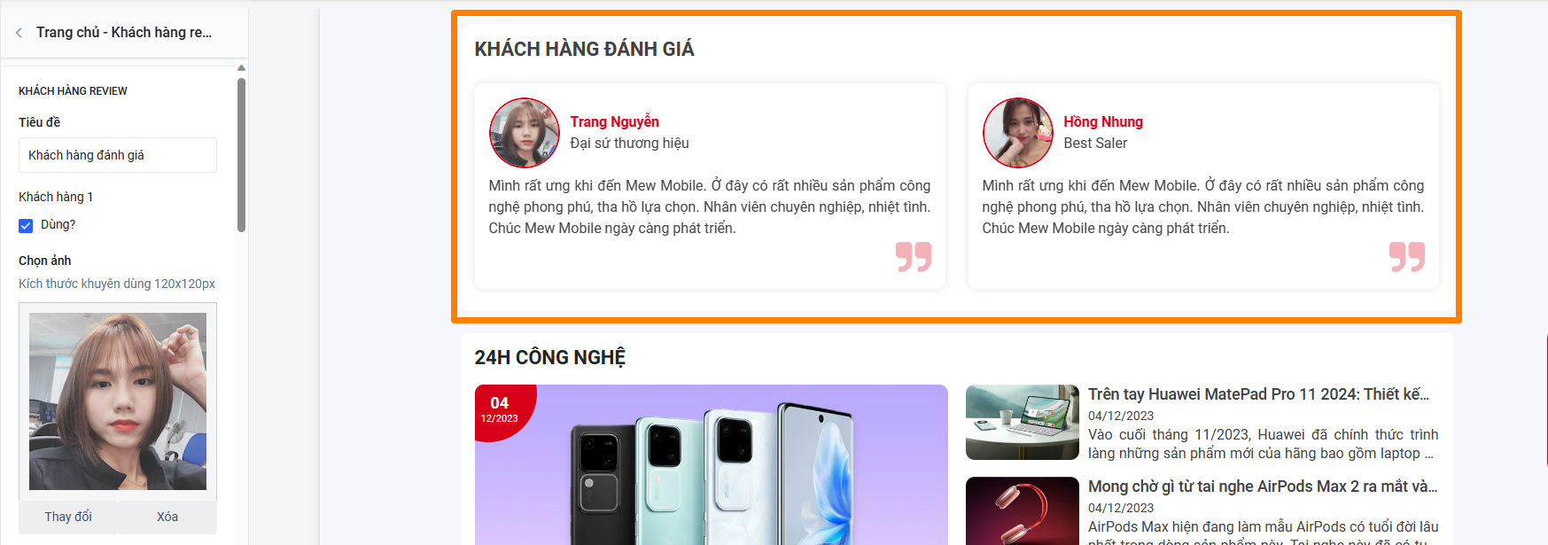 - Thay đổi hình ảnh, tên, nghề, nhận xét của khách hàng