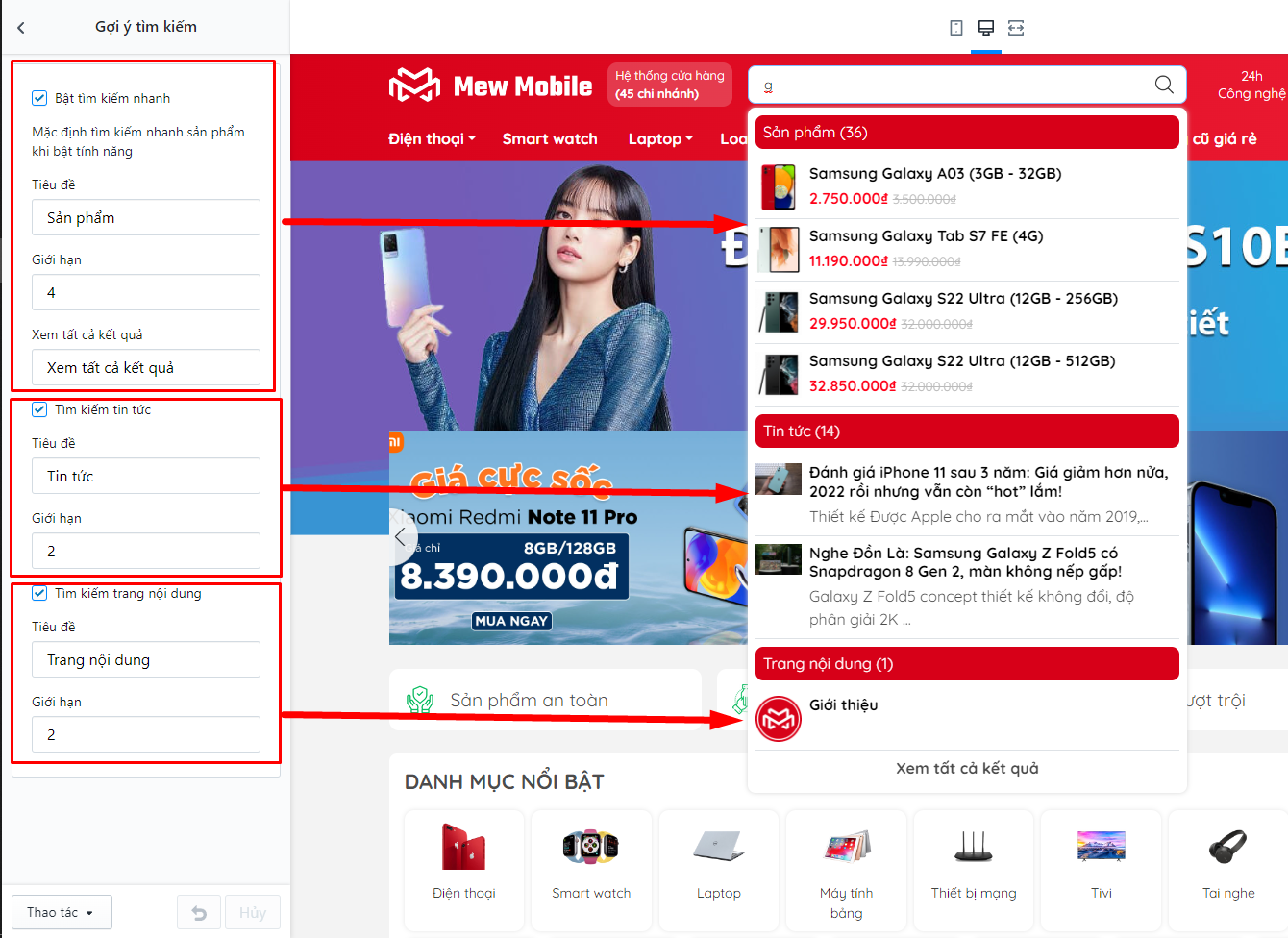 - Thay đổi số lượng kết quả hiển thị, số kết quả tìm kiếm phù hợp với từ khoá, vì lý do kỹ thuật cũng như tránh ảnh hưởng đến quá trình trải nghiệm mua hàng của quý khách, chúng tôi đề nghị không nên hiển thị quá nhiều số lượng kết quả tìm kiếm