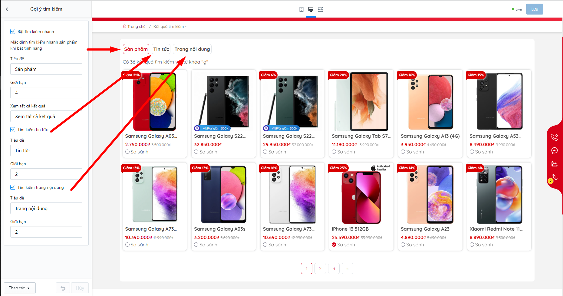 - Trang kết quả tìm kiếm cho hiển thị cả 3 loại tìm kiếm