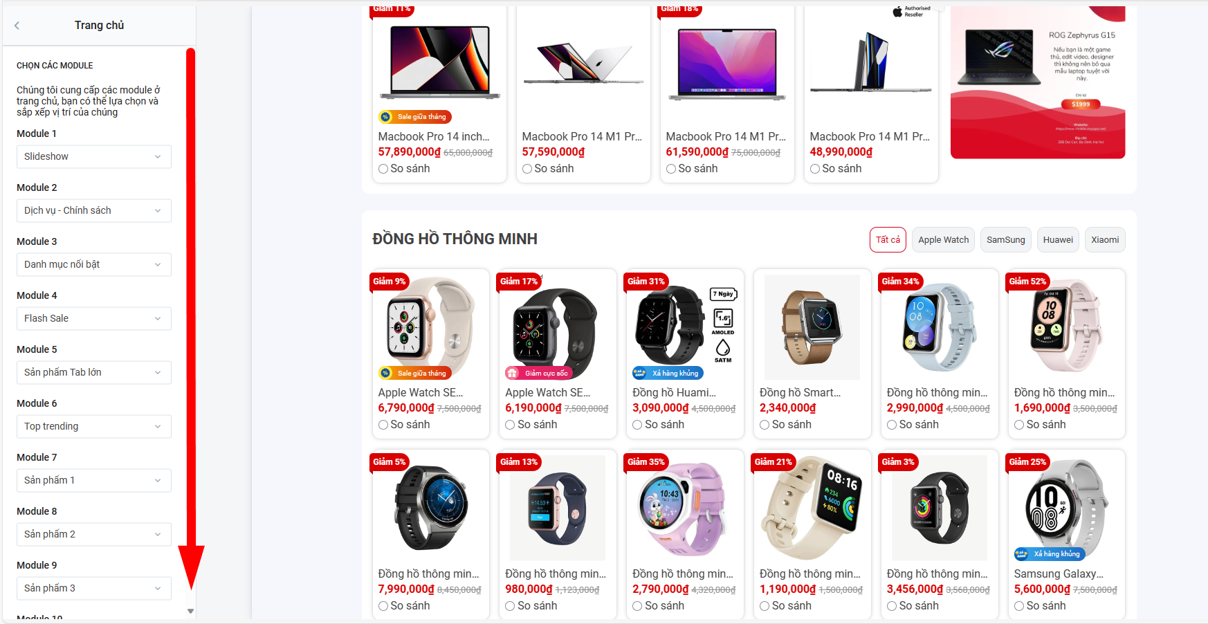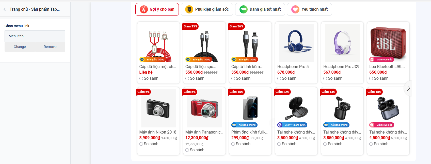 - Khách hàng thiết lập thông qua menu danh mục sản phẩm tương ứng và chọn tại thiết lập giao diện để hiển thị, có thể điều chỉnh số sản phẩm hiển thị tối đa trên 1 tab, nhưng do hạn chế từ phía hệ thống, con số này nên < 24