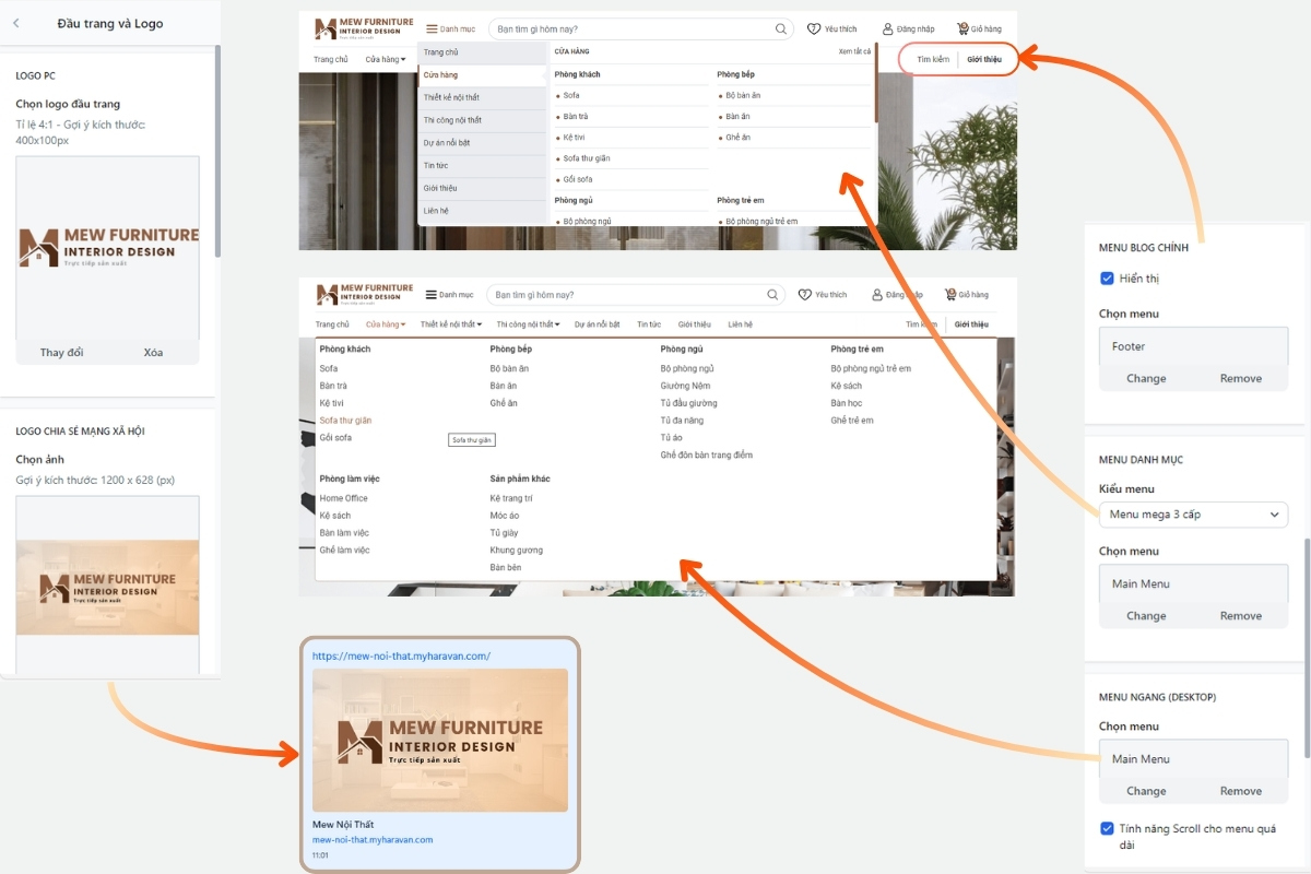 - Quản lý và thiết lập các mục liên quan đến phần đầu trang/ logo cũng như quản lý tuỳ chọn menu của bản PC và Mobile