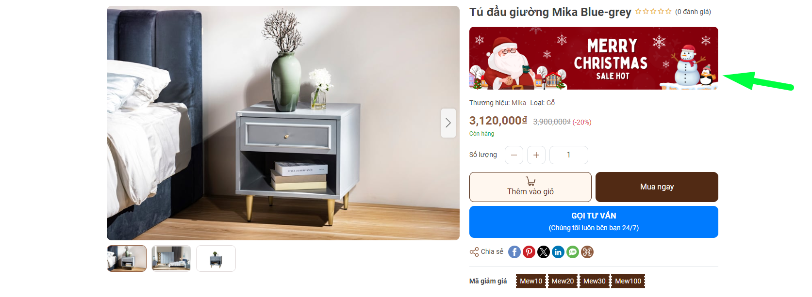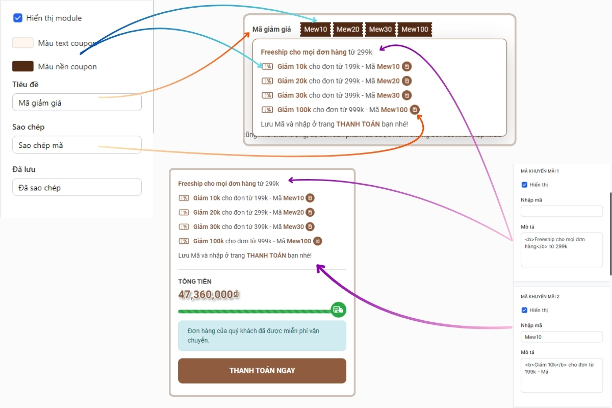 - Thiết lập/quản lý các mã giảm giá tại trang chi tiết sản phẩm và giỏ hàng