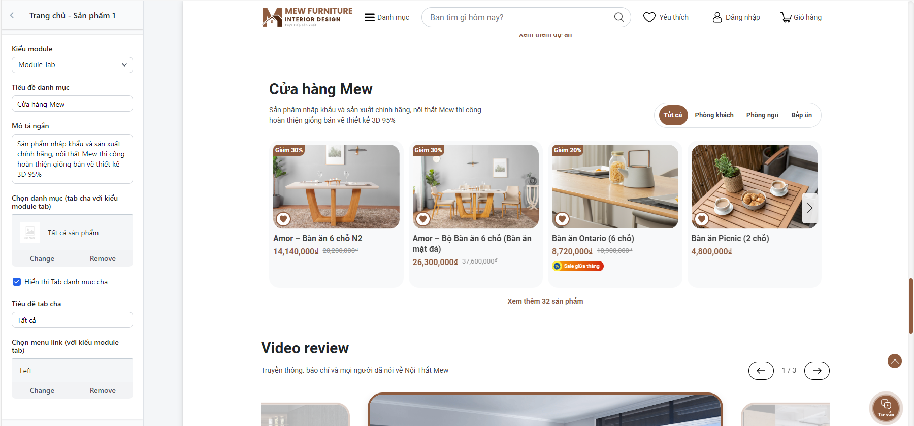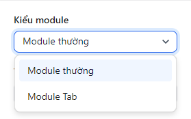 - Thiết lập tiêu đề, mô tả ngắn, lựa chọn nhóm sản phẩm (Module thường), lựa chọn menu nhóm sản phẩm (Module tab)