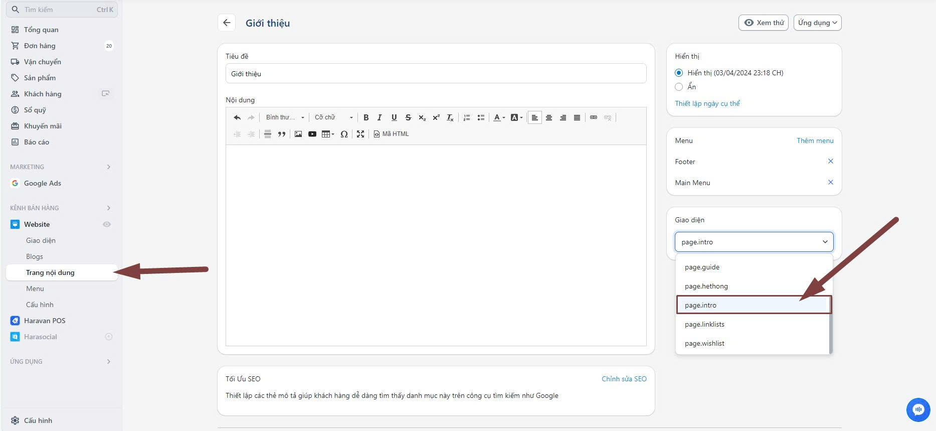 - Bước 1: tạo 1 trang nội dung => chọn giao diện page.intro