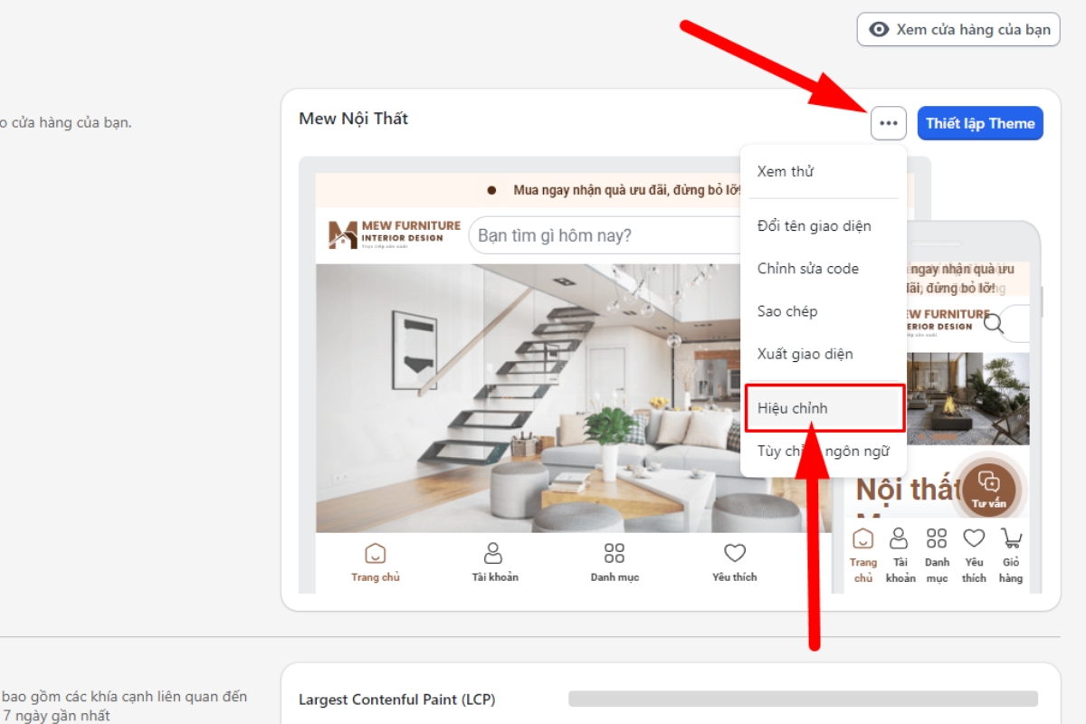 Sau khi cài đặt theme mới lên cửa hàng, bạn bấm vào THIẾT LẬP GIAO DIỆN để tùy chỉnh theme.