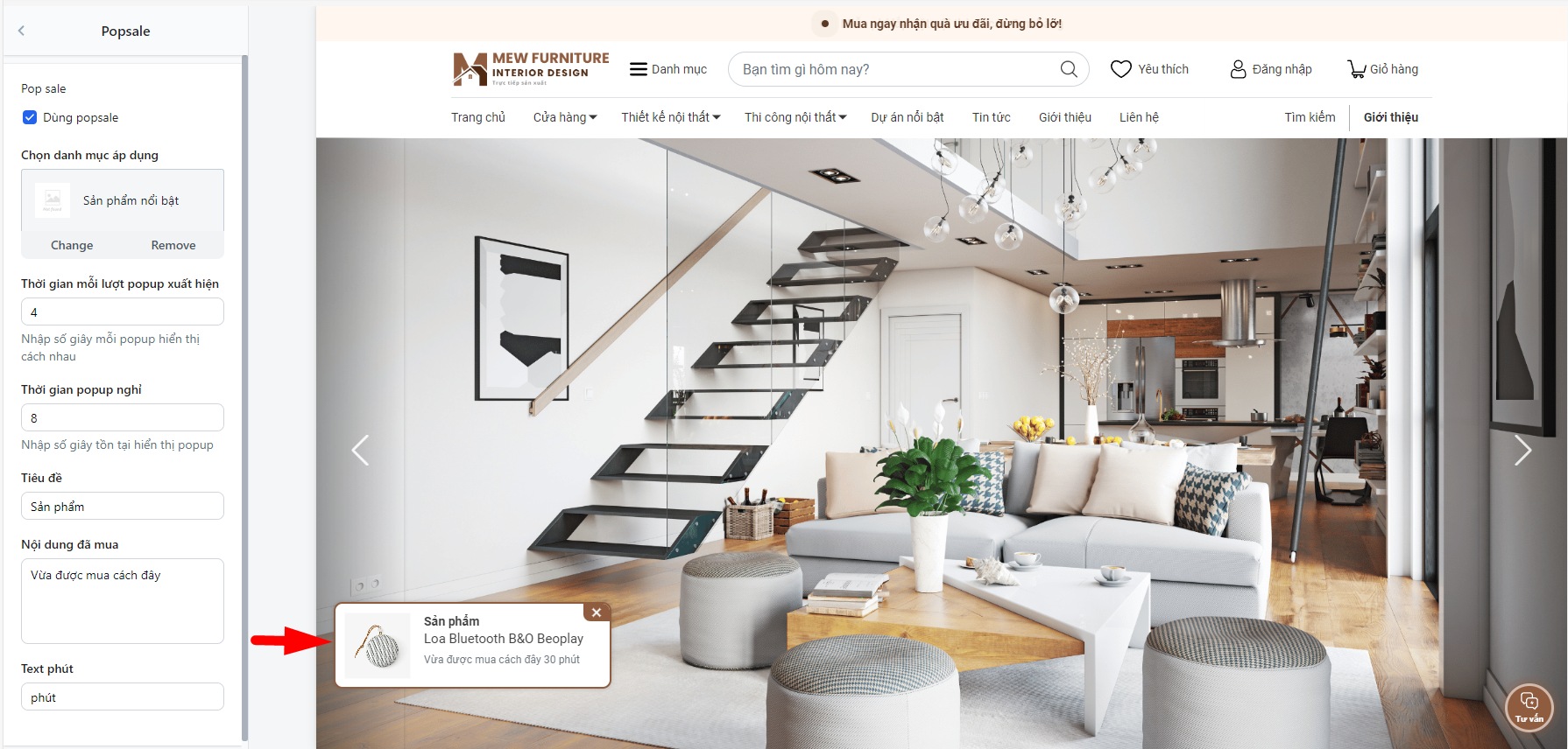 - Đầy đủ thiết lập thời gian, text cố định và lựa chọn danh mục để hiển thị ngẫu nhiên sản phẩm.