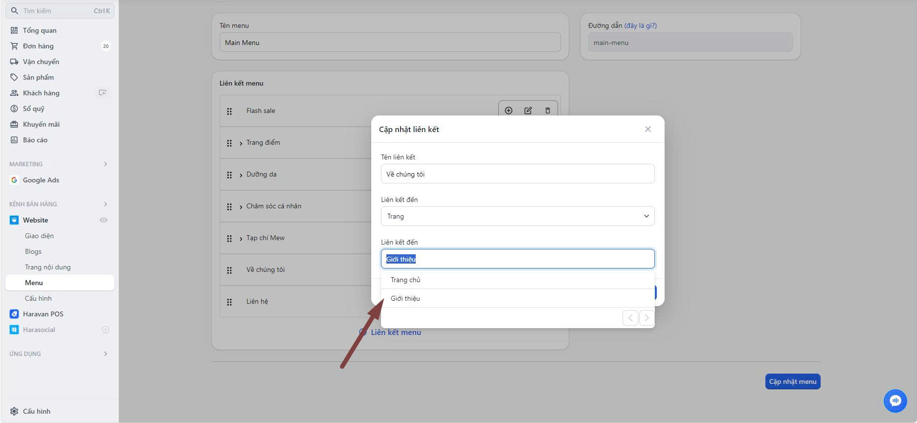 - Bước 3: Gắn link trang nội dung vào menu cần gắn
