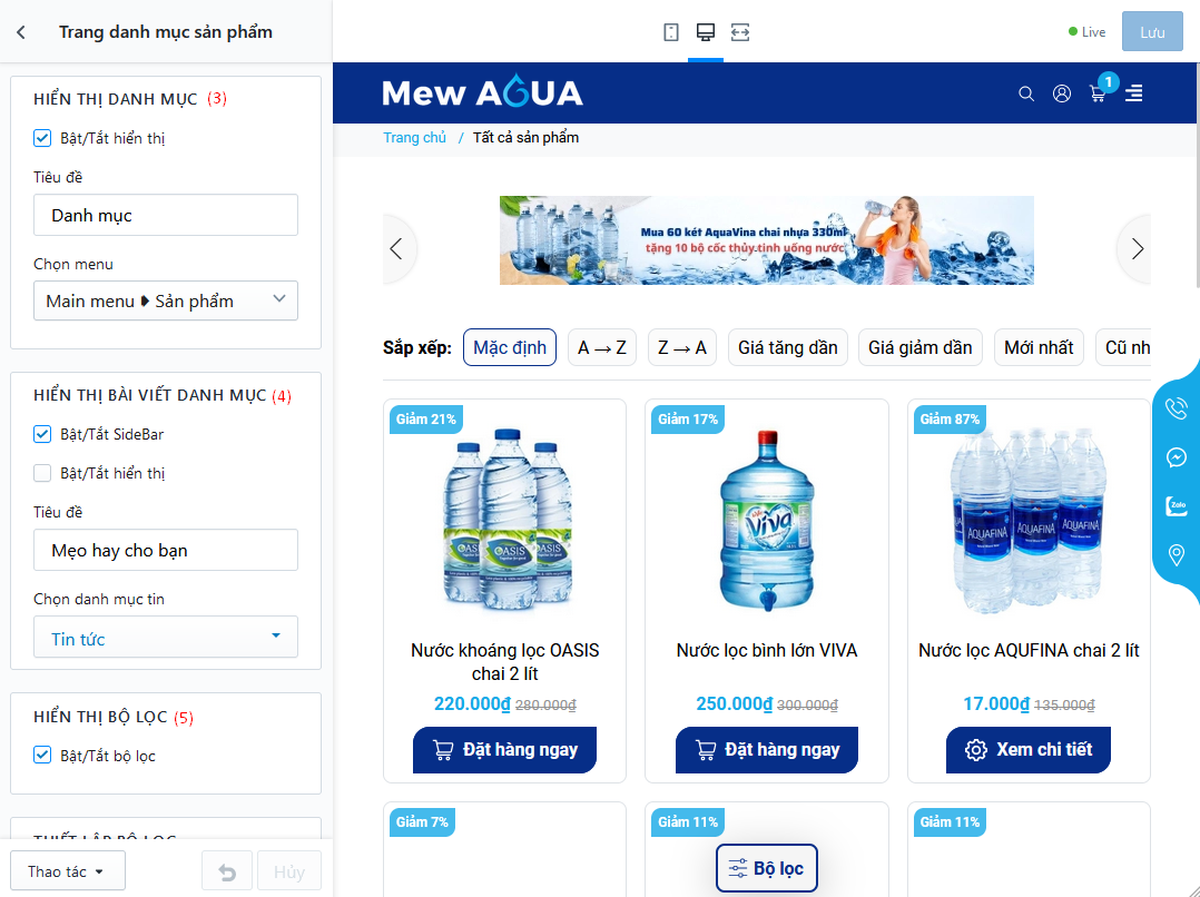 - (1) Thiết lập số lượng sản phẩm trên 1 trang, và cho phép hiển thị nút mua hàng grid item