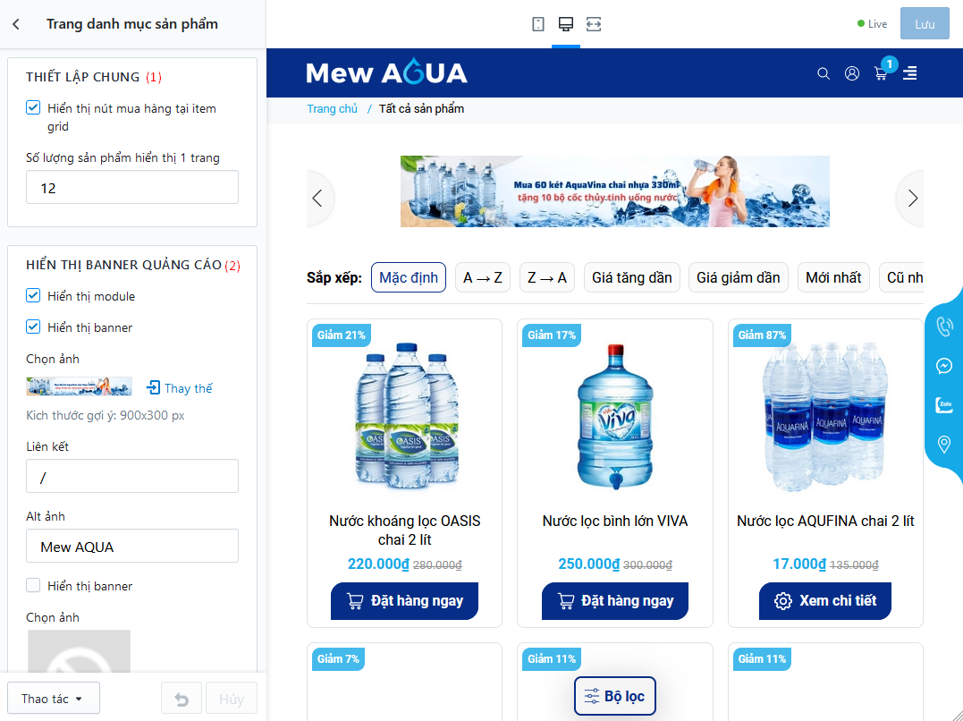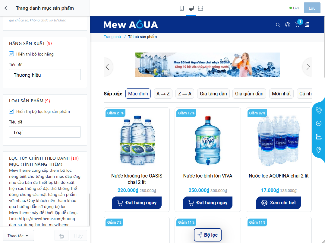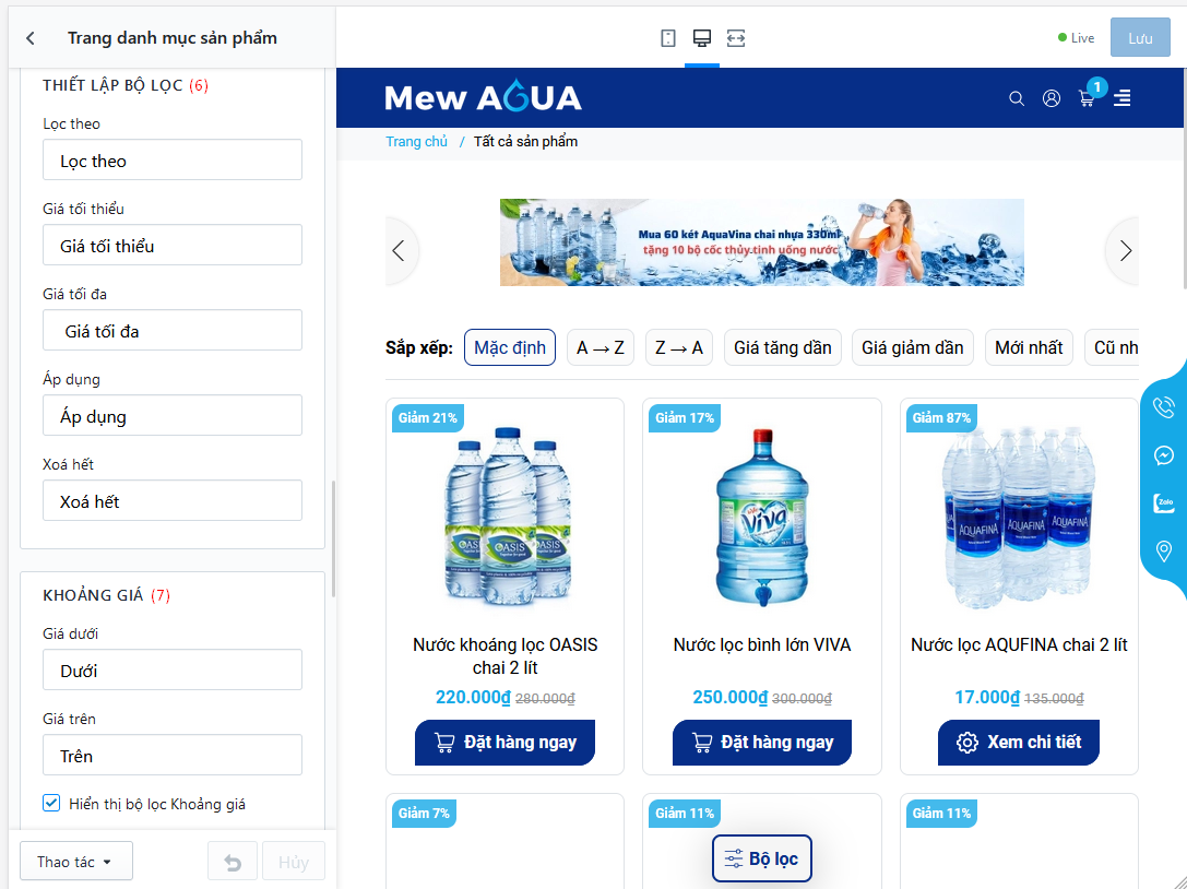 - Lọc theo khoảng giá có sẵn, các khoảng giá sẽ được phân chia theo thứ tự từ thiết lập giao diện