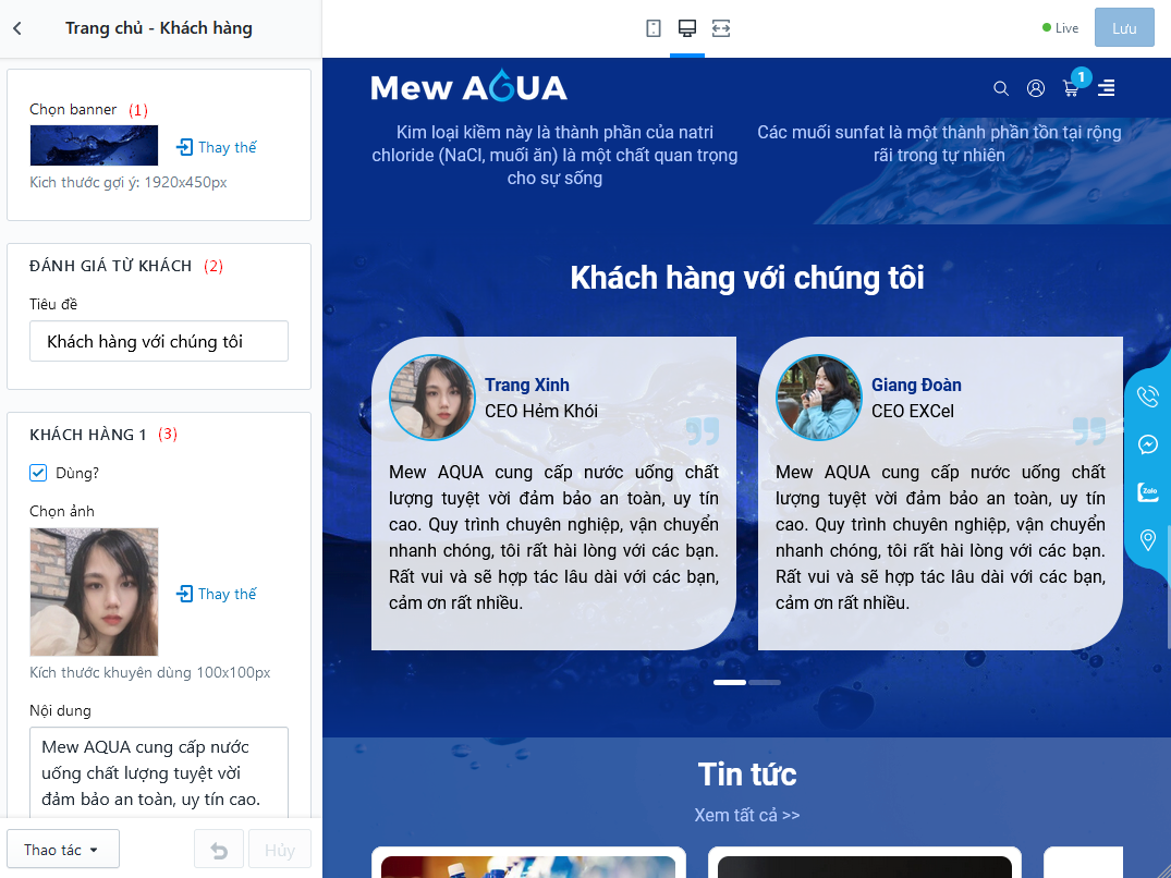- (3) Thiết lập đánh giá khách hàng gồm Ảnh, tên, chức vụ và nội dung