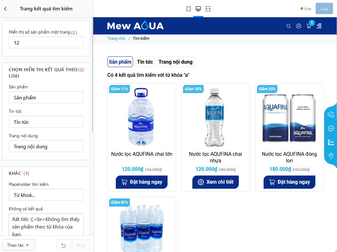 - (2, 3) Bật/tắt tìm kiếm nhanh theo bài viết/ trang nội dung, thay đổi số lượng kết quả hiển thị, số kết quả tìm kiếm phù hợp với từ khoá, vì lý do kỹ thuật cũng như tránh ảnh hưởng đến quá trình trải nghiệm mua hàng của quý khách, chúng tôi đề nghị không nên hiển thị quá nhiều số lượng kết quả tìm kiếm