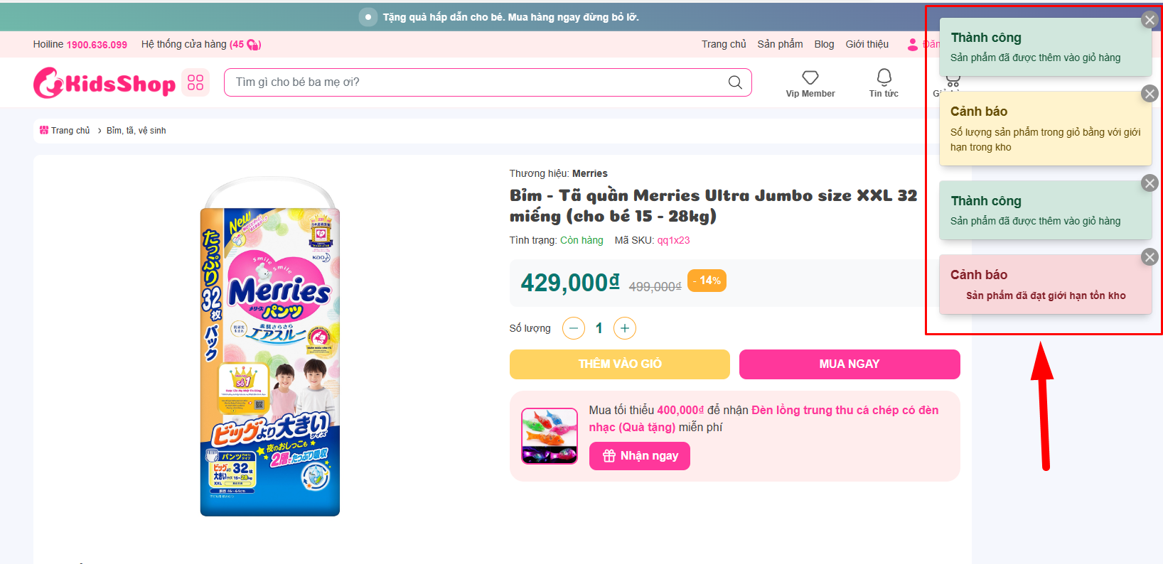 - Có các thông báo phù hợp theo tồn kho của sản phẩm ngay khi người mua hàng thao tác mua sản phẩm tại các trang trên website của bạn.